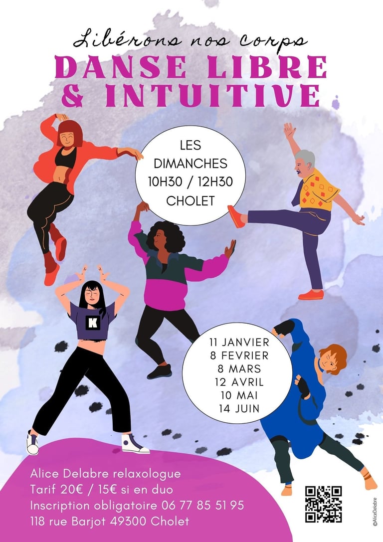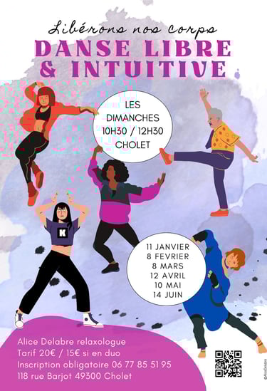 Une rencontre authentique en vous-même en suivant votre intuition. Vous abandonner dans l'apesanteur et la confiance de votre corps, pour laisser s'exprimer ce qui a besoin de l'être par la danse et les mouvements.
